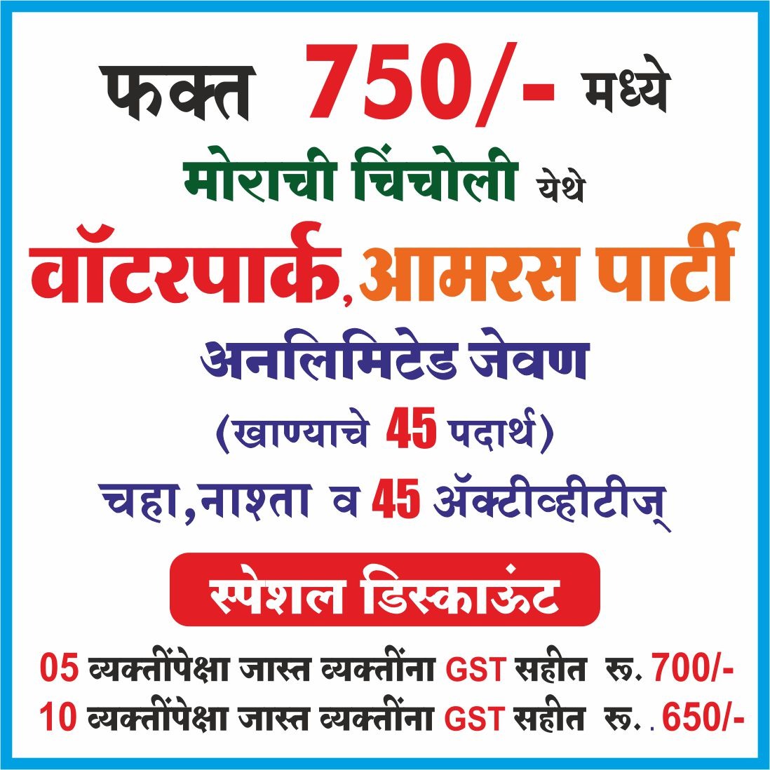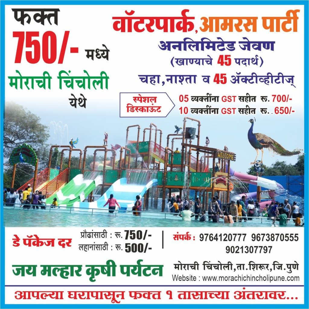 रुपये 750/- मध्ये आमरस पार्टी,खाद्य महोत्सव, वॉटर पार्क,अनलिमिटेड जेवण( खाण्याचे 45 मेनू),चहा व नाष्टा व 45 ऍक्टिव्हिटी
